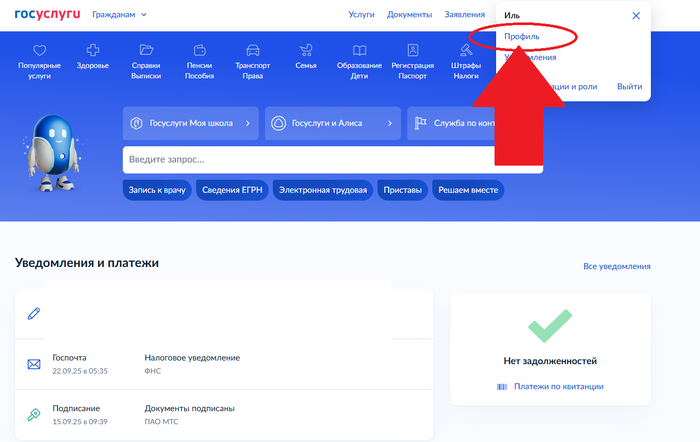 Нажатие на аватарку в правом верхнем углу откроет небольшое меню