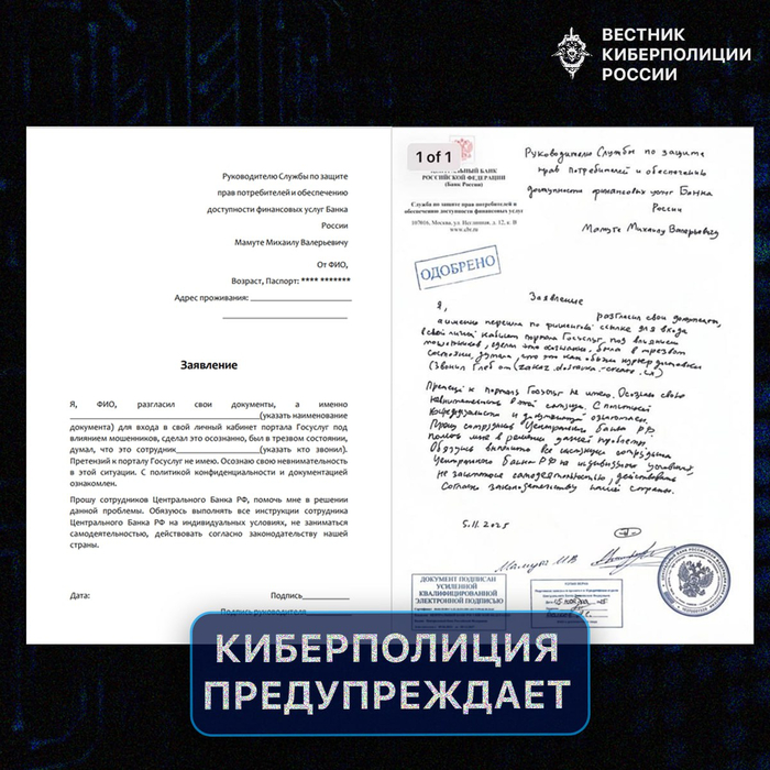 Заявление. Требуют подписать заявление, в котором жертва признает свою "Вину", просит помощи у "Центрального банка", гарантирует исполнение всех инструкций со своей стороны и обещание "не заниматься самодеятельностью" (и эта формулировка как бы в заявлении, которое как бы, для Центрального банка! А чего не добавили что надо еще в конце написать "бля буду атвичаю"?)