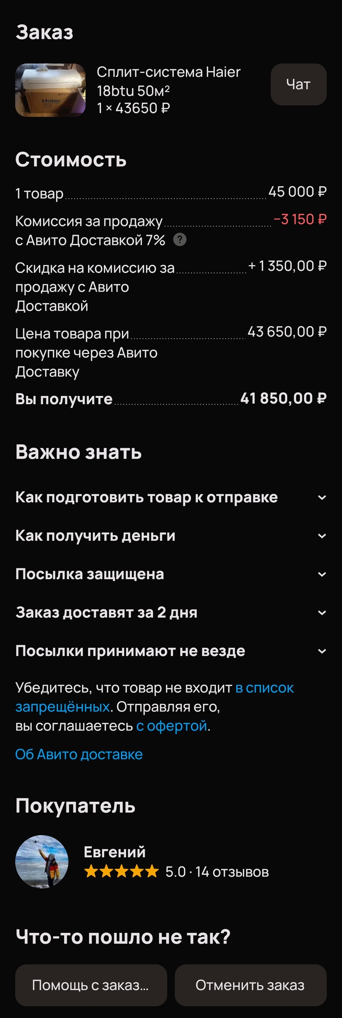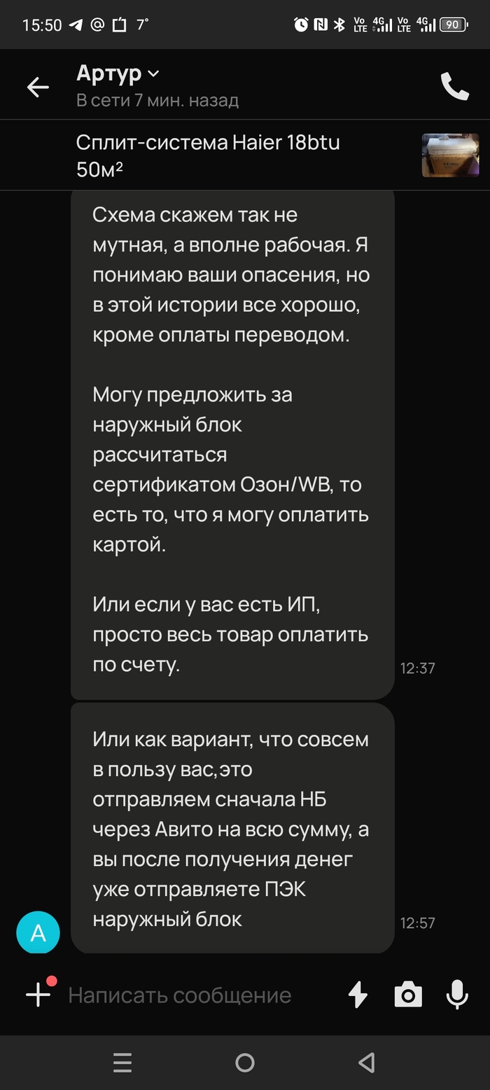 Я предложил ему отправить через авито-доставку внутренний блок за 1/3 цены, а внешний блок, как он и хотел пеком, но при условии предоплаты 2/3 оставшейся суммы.