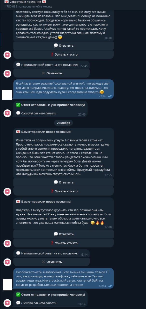 Значит, был у меня в Телеграме один интересный период. Написал бот @SecretPoslaniyaBot. Суть — анонимные послания. Ну, думаю, кто-то из бывших стесняется или подруга решила пофлиртовать. Начинаю переписку.